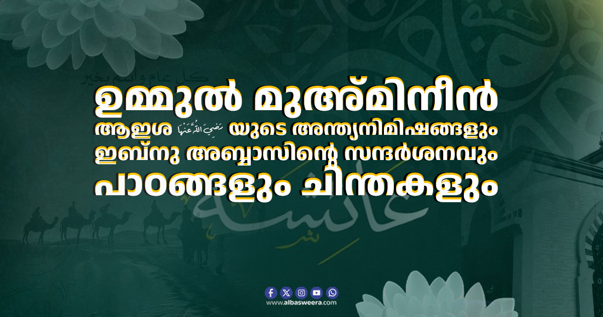 പ്രവാചകപത്നിമാരിൽ അഗ്രഗണ്യയും പണ്ഡിതയുമായിരുന്ന ഉമ്മുൽ മുഅ്മിനീൻ ആഇശ (رَضِيَ اللَّهُ عَنْهَا) യുടെ ജീവിതത്തിലെ അവസാന നിമിഷങ്ങൾ ചരിത്രത്തിൽ ഏറെ ശ്രദ്ധേയമാണ്. ഇസ്ലാമിക ലോകത്തിന് വിജ്ഞാനത്തിന്റെ വെളിച്ചം പകർന്നുനൽകിയ ആ മഹതി, മരണത്തെ മുഖാമുഖം കണ്ടപ്പോൾ പ്രകടിപ്പിച്ച ഭയഭക്തിയും വിനയവും സത്യവിശ്വാസികൾക്ക് എക്കാലത്തും മാതൃകയാണ്. ആഇശ (رَضِيَ اللَّهُ عَنْهَا) യുടെ അന്ത്യസമയത്ത് പ്രമുഖ സ്വഹാബിവര്യനായ ഇബ്നു അബ്ബാസ് (رَضِيَ اللَّهُ عَنْهُمَا) സന്ദർശിക്കാനെത്തിയ സംഭവവും, തുടർന്നുണ്ടായ സംഭാഷണങ്ങളും അപഗ്രഥിക്കുന്ന പഠനമാണിത്.